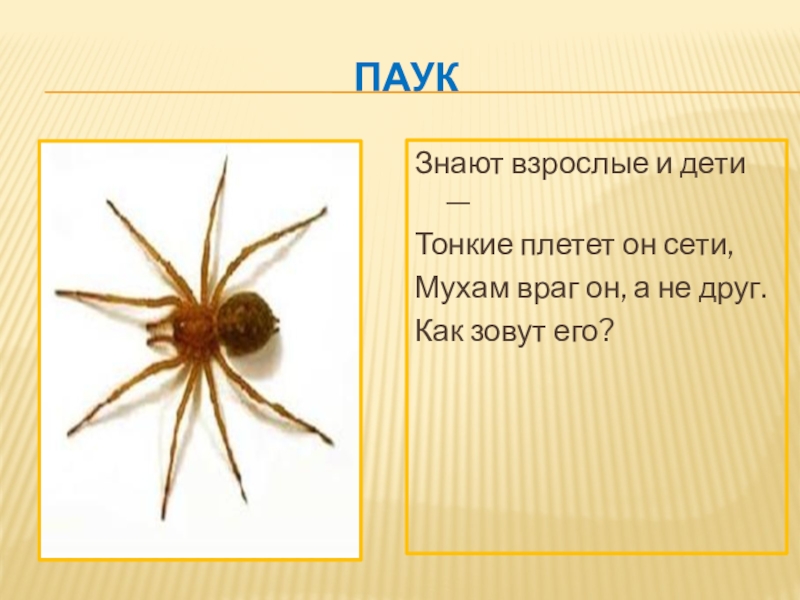 паукЗнают взрослые и дети —Тонкие плетет он сети,Мухам враг он, а не друг.Как зовут его?