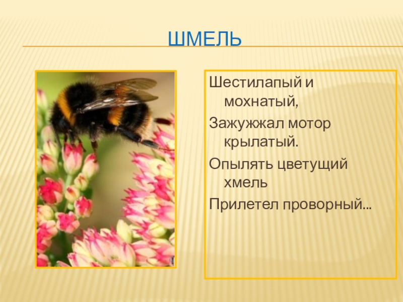 шмельШестилапый и мохнатый,Зажужжал мотор крылатый.Опылять цветущий хмельПрилетел проворный...