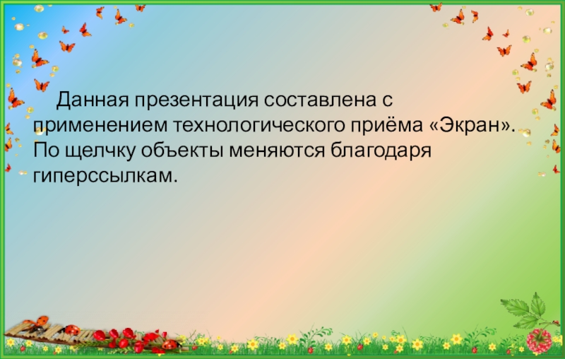 Данная презентация составлена с применением технологического приёма «Экран». По щелчку объекты меняются благодаря гиперссылкам.