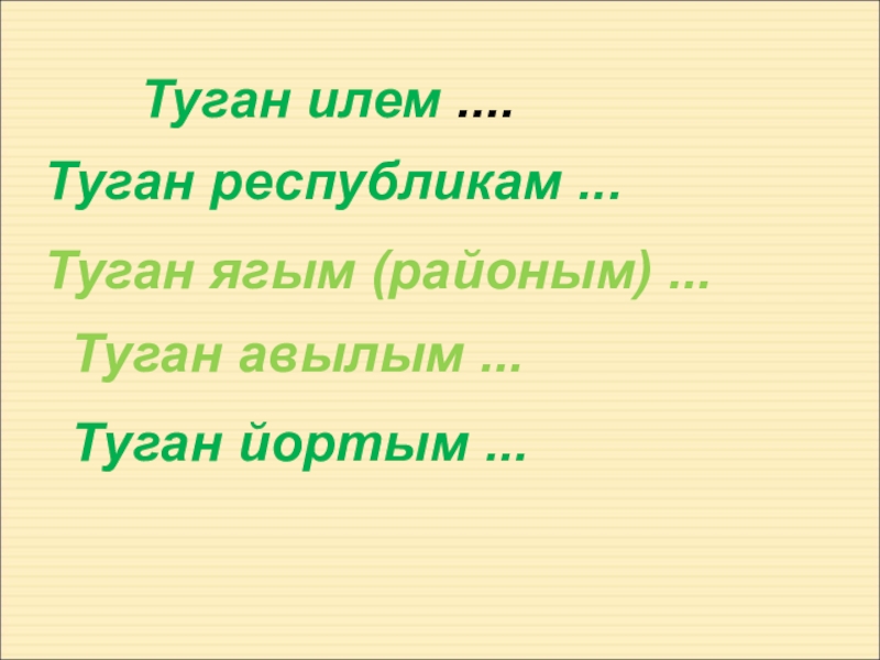 Туган илем ....Туган республикам ...Туган ягым (районым) ...Туган авылым ...Туган йортым ...