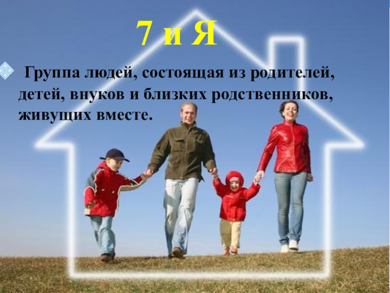 7 и Я Группа людей, состоящая из родителей, детей, внуков и близких родственников, живущих вместе.