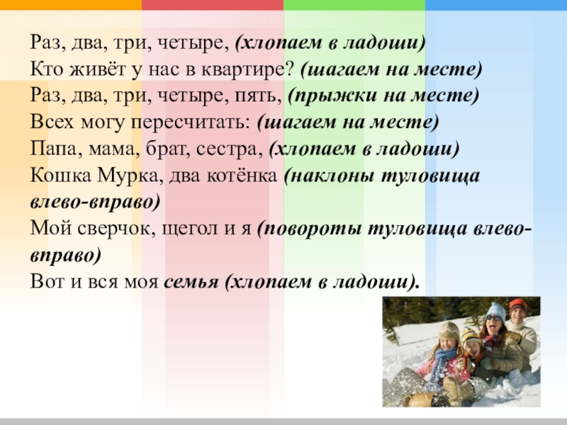 .Раз, два, три, четыре, (хлопаем в ладоши)Кто живёт у нас в квартире? (шагаем на месте)Раз, два, три,