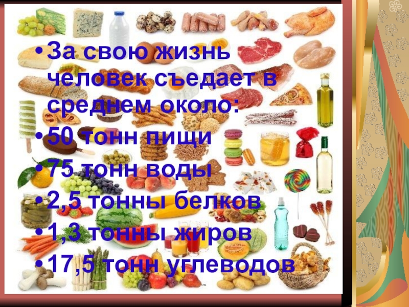 За свою жизнь человек съедает в среднем около: 50 тонн пищи75 тонн воды2,5 тонны белков1,3 тонны жиров17,5 тонн углеводов