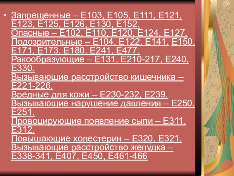 Слайд 11Запрещенные – Е103, Е105, Е111, Е121, Е123, Е125, Е126, Е130, Е152.