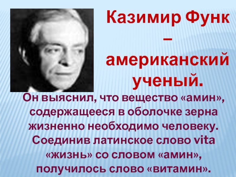 Казимир Функ – американский ученый.Он выяснил, что вещество «амин», содержащееся в оболочке зерна жизненно необходимо человеку. Соединив