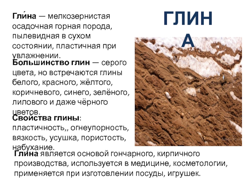Глина является основой гончарного, кирпичного производства, используется в медицине, косметологии, применяется при изготовлении посуды, игрушек.