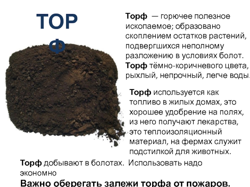 Торф используется как топливо в жилых домах, это хорошее удобрение на полях, из него получают лекарства, это теплоизоляционный материал, на фермах служит подстилкой для животных.