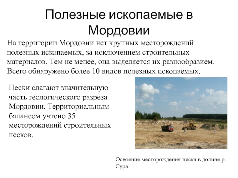 Пески слагают значительную часть геологического разреза Мордовии. Территориальным балансом учтено 35 месторождений строительных песков.