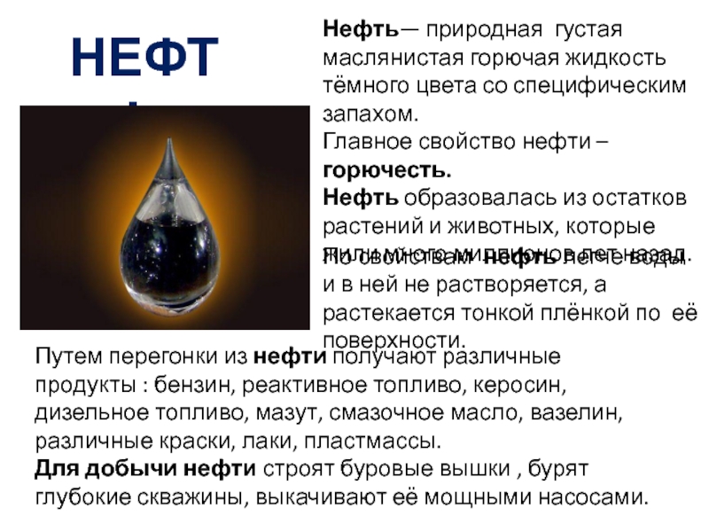 По свойствам нефть легче воды и в ней не растворяется, а растекается тонкой плёнкой по её поверхности.