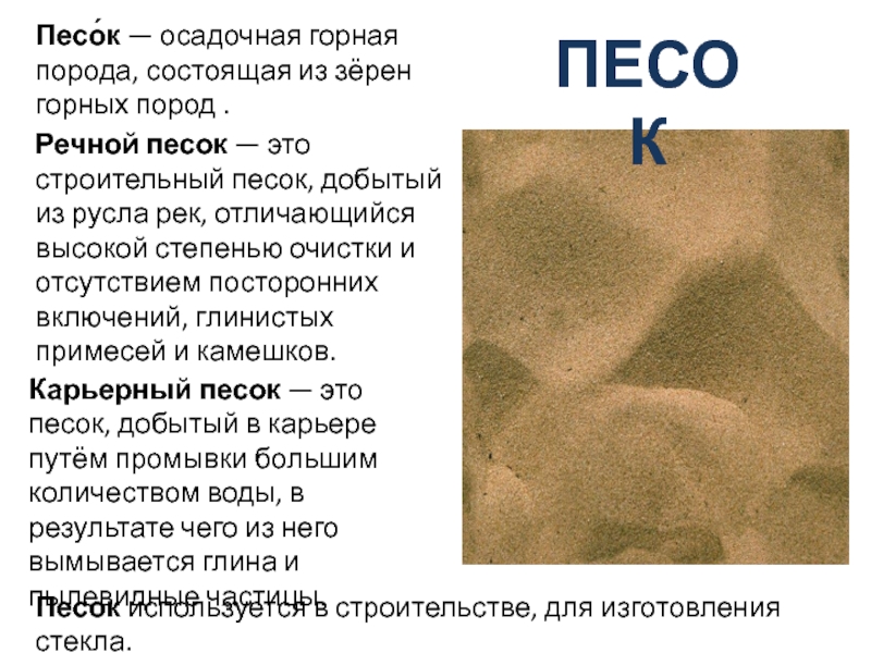Песок используется в строительстве, для изготовления стекла.