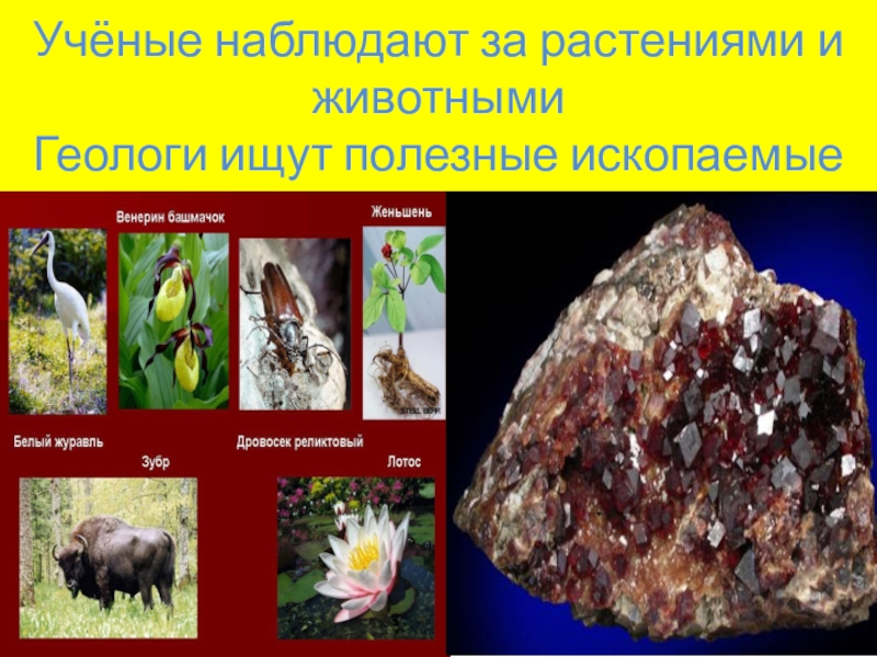 Слайд 4Учёные наблюдают за растениями и животными Геологи ищут полезные ископаемые