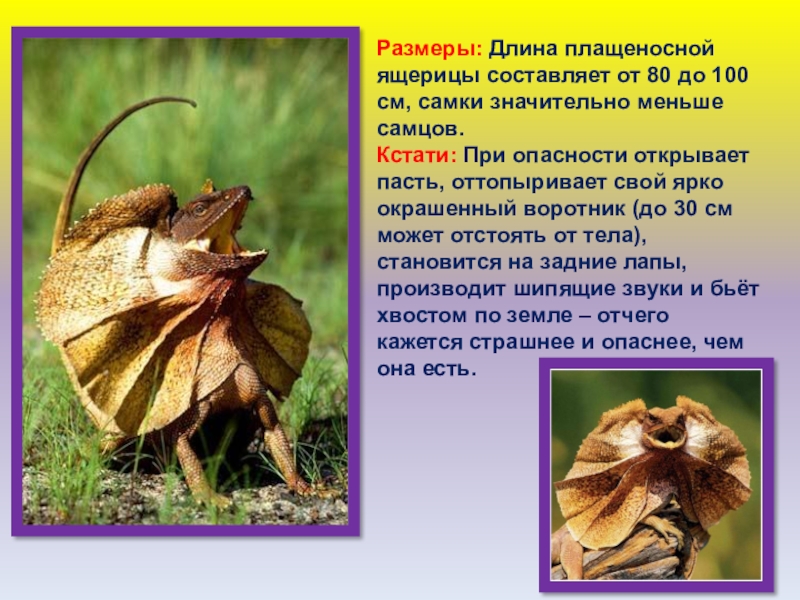 Слайд 55Размеры: Длина плащеносной ящерицы составляет от 80 до 100 см, самки