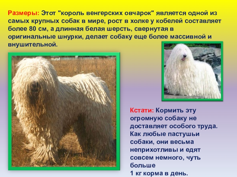 Слайд 10Размеры: Этот "король венгерских овчарок" является одной из самых крупных собак