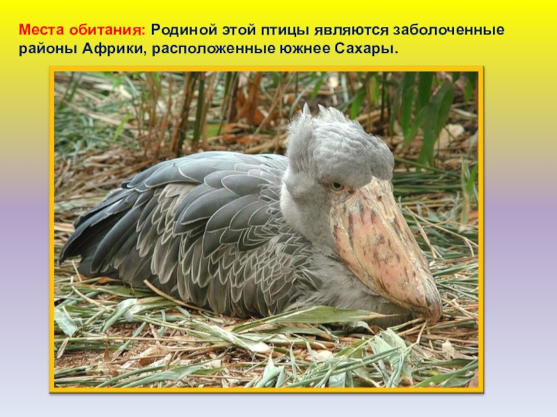 Слайд 68Места обитания: Родиной этой птицы являются заболоченные районы Африки, расположенные южнее