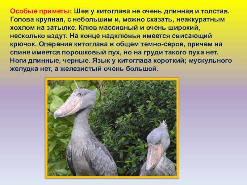 Слайд 69Особые приметы: Шея у китоглава не очень длинная и толстая. Голова