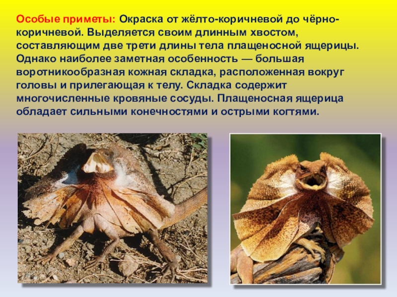 составляющим две трети длины тела плащеносной ящерицы. Однако наиболее заметная особенность — большая воротникообразная кожная складка, расположенная вокруг головы и прилегающая к телу. Складка содержит многочисленные кровяные сосуды. Плащеносная ящерица обладает сильными конечностями и острыми когтями.