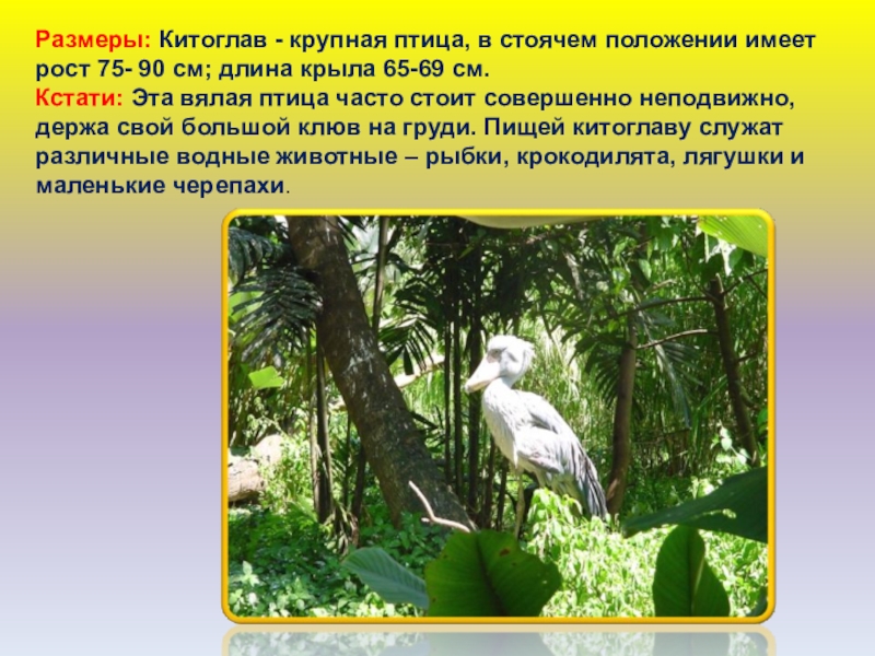 Слайд 70Размеры: Китоглав - крупная птица, в стоячем положении имеет рост 75-