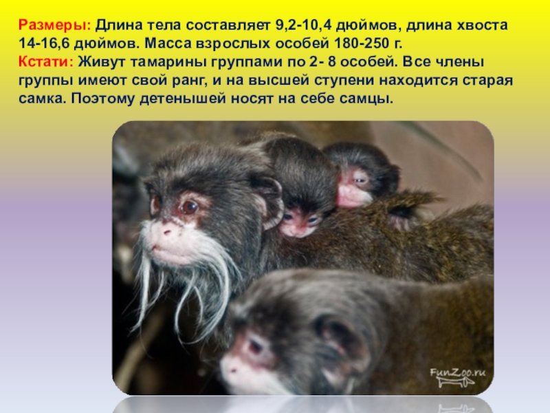 Кстати: Живут тамарины группами по 2- 8 особей. Все члены группы имеют свой ранг, и на высшей ступени находится старая самка. Поэтому детенышей носят на себе самцы.