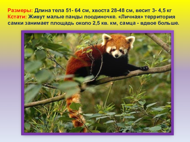 Кстати: Живут малые панды поодиночке. «Личная» территория самки занимает площадь около 2,5 кв. км, самца - вдвое больше.