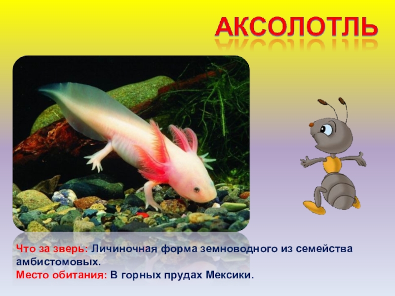 Слайд 40Что за зверь: Личиночная форма земноводного из семейства амбистомовых.