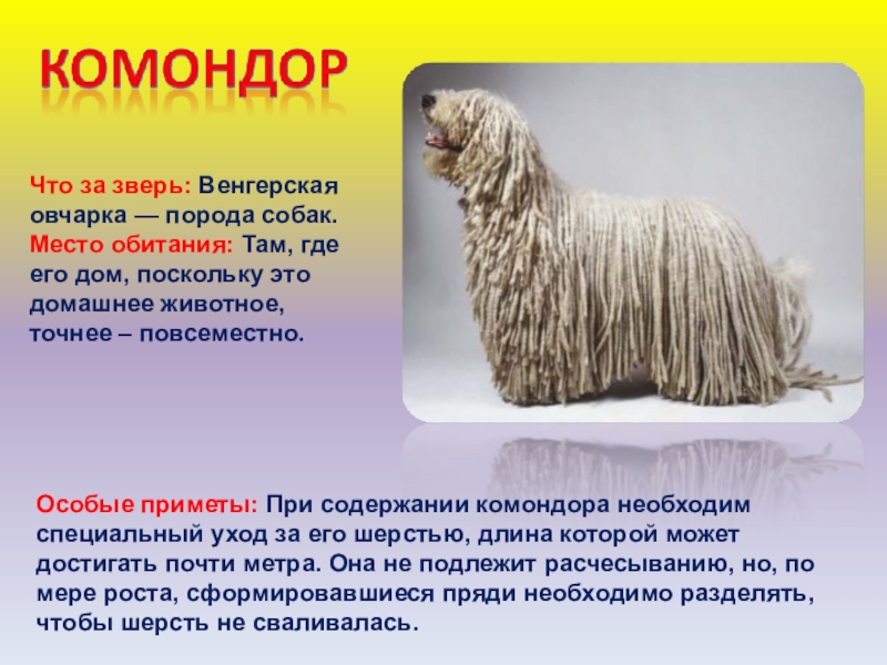Слайд 9Особые приметы: При содержании комондора необходим специальный уход за его шерстью,