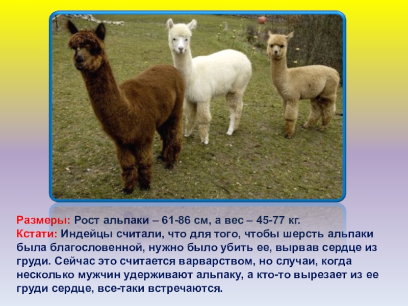 Слайд 46Размеры: Рост альпаки – 61-86 см, а вес – 45-77 кг.