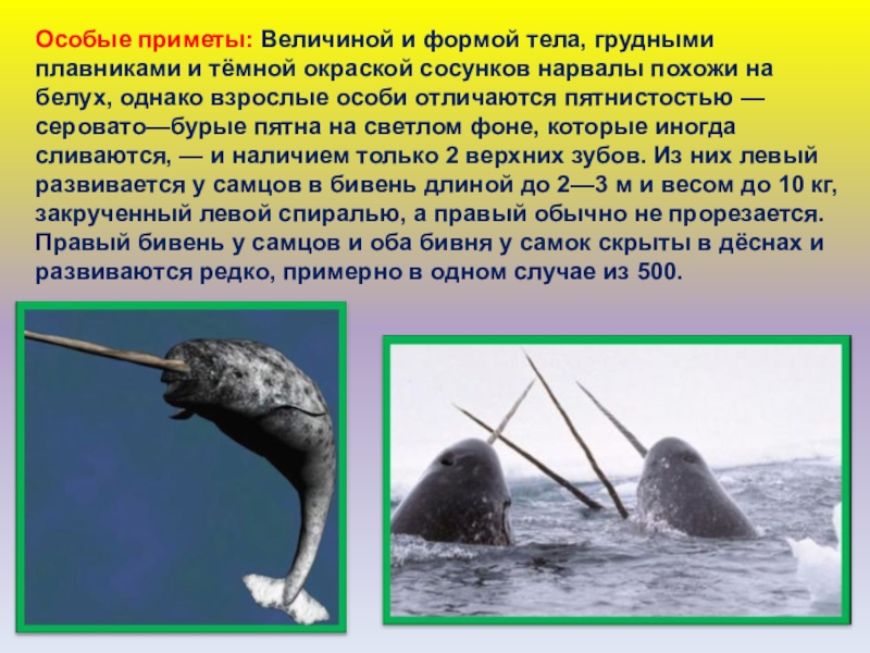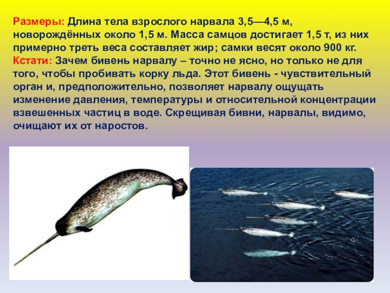 Слайд 58Размеры: Длина тела взрослого нарвала 3,5—4,5 м, новорождённых около 1,5 м.