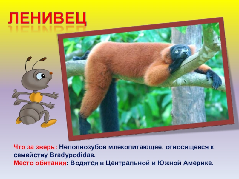 Слайд 19Что за зверь: Неполнозубое млекопитающее, относящееся к семейству Bradypodidae.