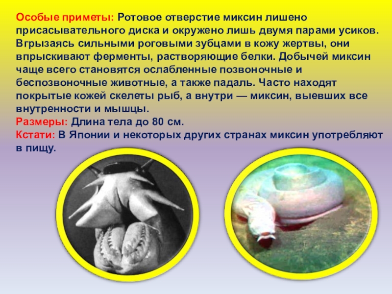 Слайд 33Особые приметы: Ротовое отверстие миксин лишено присасывательного диска и окружено лишь