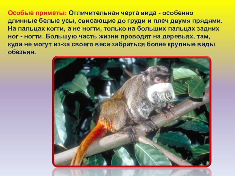 Слайд 24Особые приметы: Отличительная черта вида - особенно длинные белые усы, свисающие