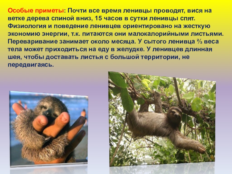 спиной вниз, 15 часов в сутки ленивцы спят. Физиология и поведение ленивцев ориентировано на жесткую экономию энергии, т.к. питаются они малокалорийными листьями. Переваривание занимает около месяца. У сытого ленивца ⅔ веса тела может приходиться на еду в желудке. У ленивцев длинная шея, чтобы доставать листья с большой территории, не передвигаясь.