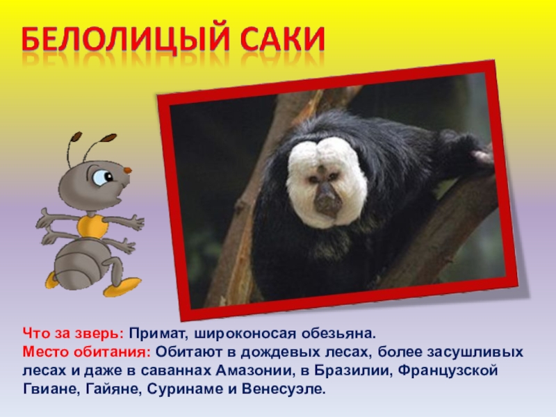 Слайд 26Что за зверь: Примат, широконосая обезьяна.