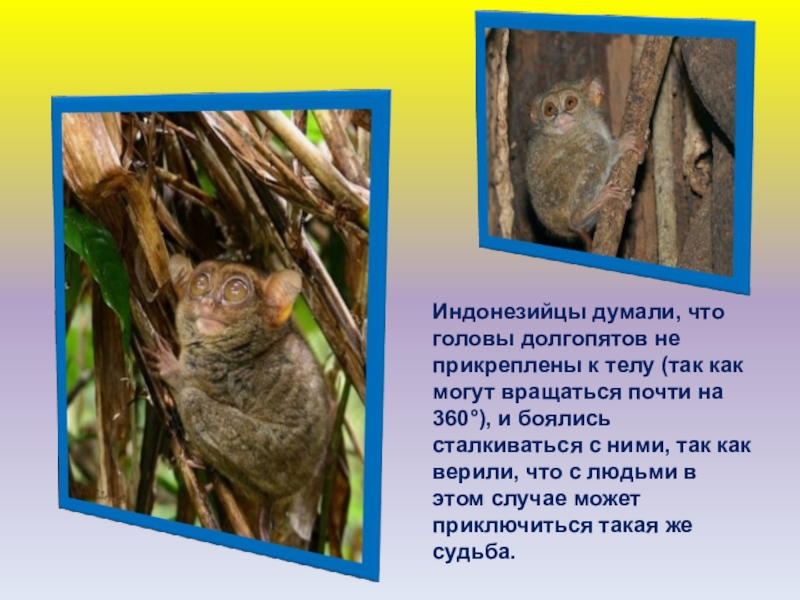 Слайд 50Индонезийцы думали, что головы долгопятов не прикреплены к телу (так как