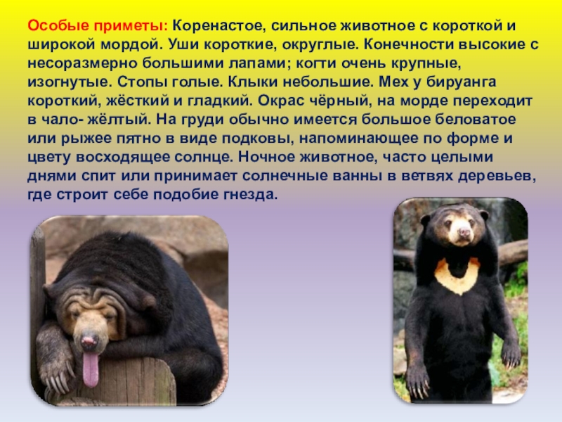 короткие, округлые. Конечности высокие с несоразмерно большими лапами; когти очень крупные, изогнутые. Стопы голые. Клыки небольшие. Мех у бируанга короткий, жёсткий и гладкий. Окрас чёрный, на морде переходит в чало- жёлтый. На груди обычно имеется большое беловатое или рыжее пятно в виде подковы, напоминающее по форме и цвету восходящее солнце. Ночное животное, часто целыми днями спит или принимает солнечные ванны в ветвях деревьев, где строит себе подобие гнезда.