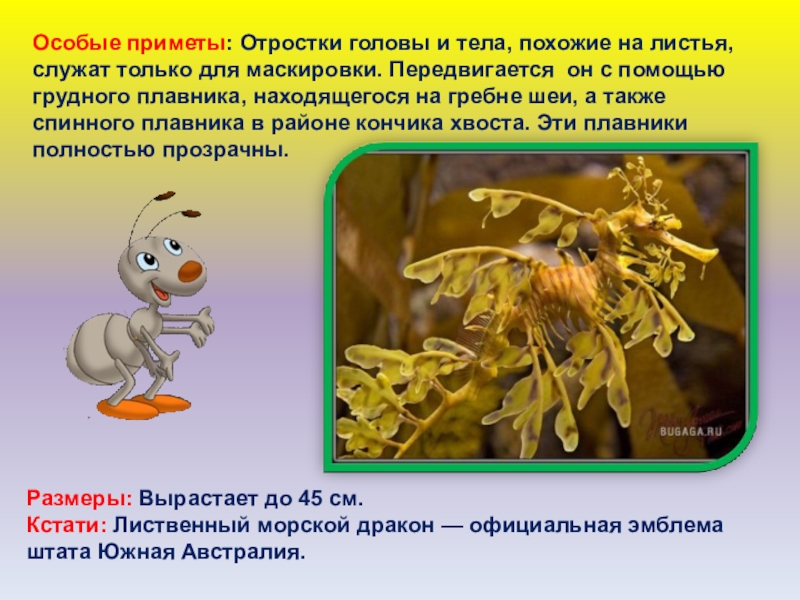 Особые приметы: Отростки головы и тела, похожие на листья, служат только для маскировки. Передвигается он с помощью грудного плавника, находящегося на гребне шеи, а также спинного плавника в районе кончика хвоста. Эти плавники полностью прозрачны.