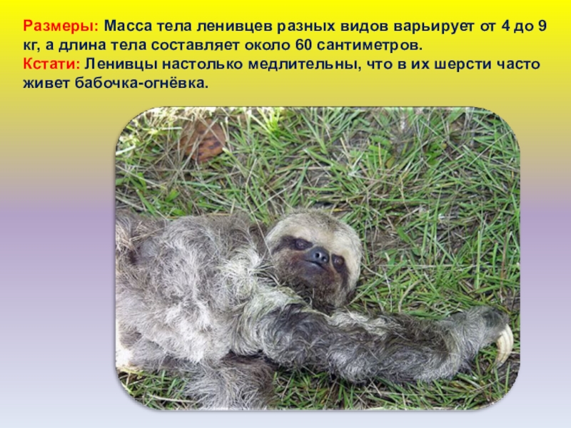 Слайд 22Размеры: Масса тела ленивцев разных видов варьирует от 4 до 9