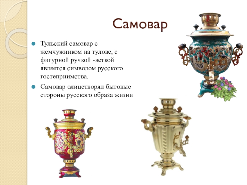 Тульский самовар с жемчужником на тулове, с фигурной ручкой -веткой является