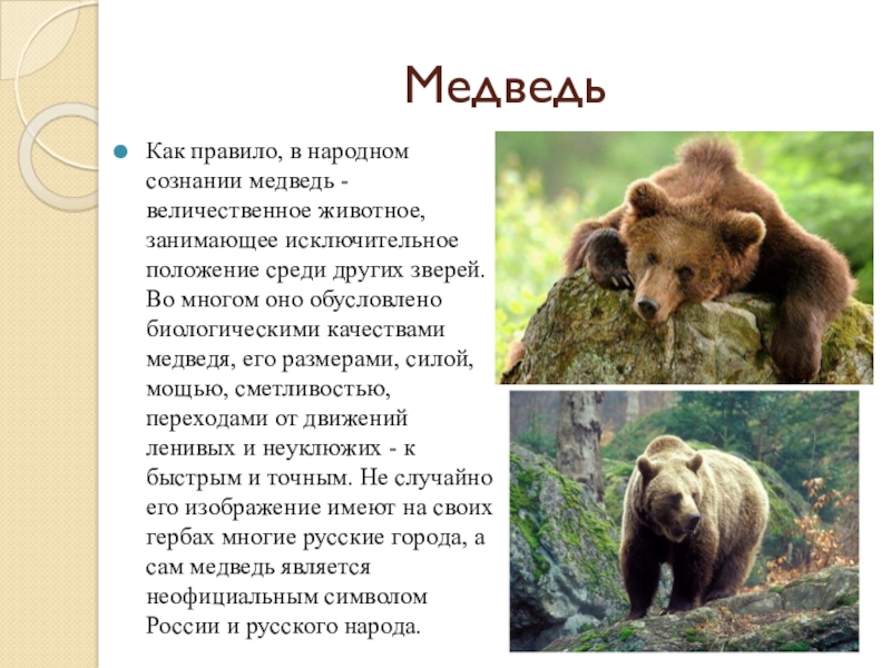 положение среди других зверей. Во многом оно обусловлено биологическими качествами медведя, его размерами, силой, мощью, сметливостью, переходами от движений ленивых и неуклюжих - к быстрым и точным. Не случайно его изображение имеют на своих гербах многие русские города, а сам медведь является неофициальным символом России и русского народа.