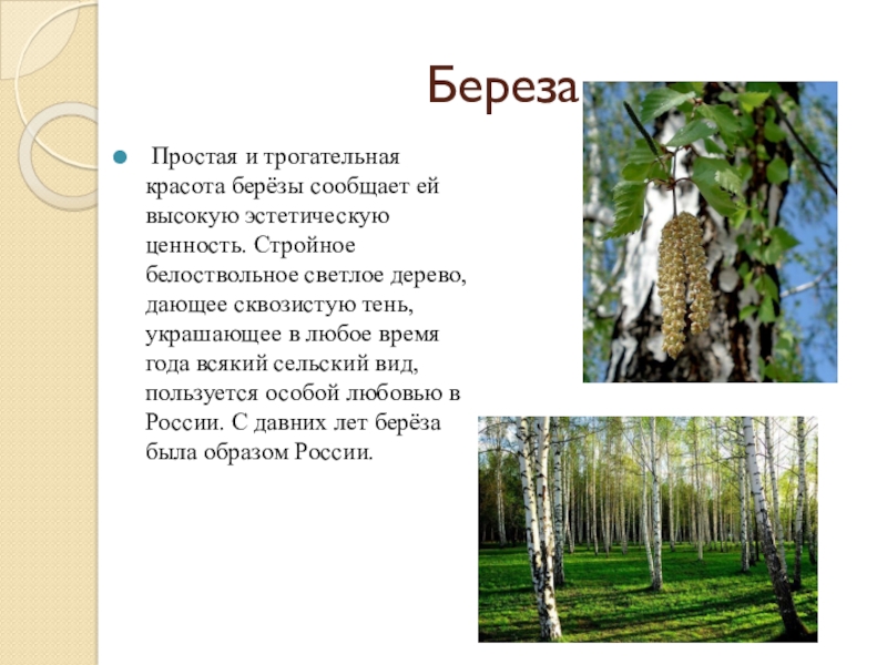 Простая и трогательная красота берёзы сообщает ей высокую эстетическую ценность.