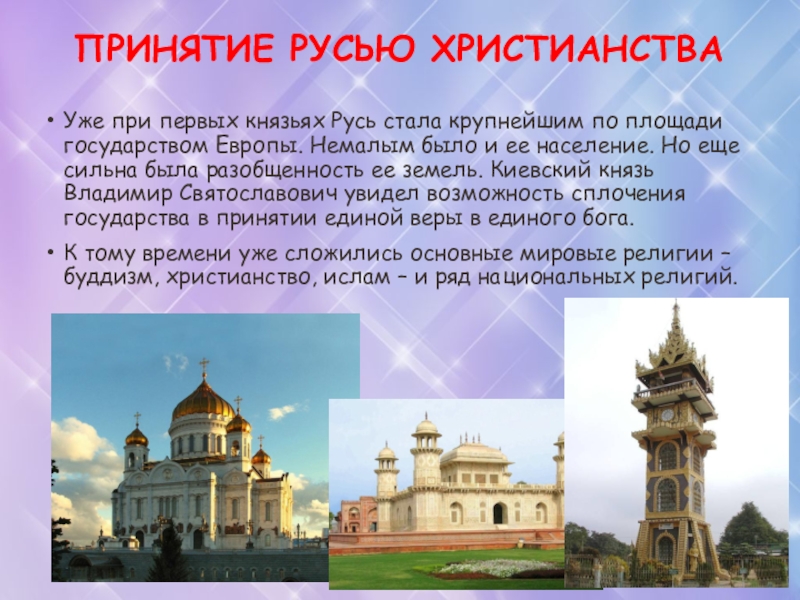 государством Европы. Немалым было и ее население. Но еще сильна была разобщенность ее земель. Киевский князь Владимир Святославович увидел возможность сплочения государства в принятии единой веры в единого бога.