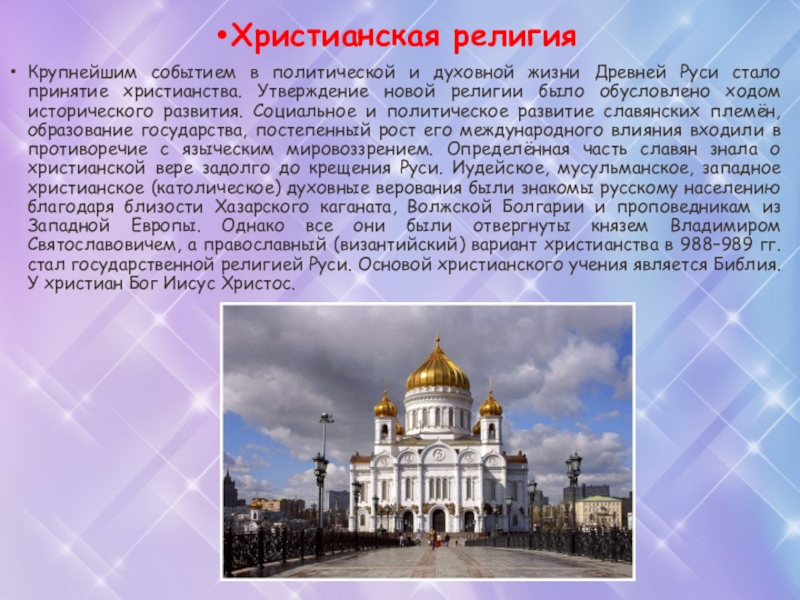 принятие христианства. Утверждение новой религии было обусловлено ходом исторического развития. Социальное и политическое развитие славянских племён, образование государства, постепенный рост его международного влияния входили в противоречие с языческим мировоззрением. Определённая часть славян знала о христианской вере задолго до крещения Руси. Иудейское, мусульманское, западное христианское (католическое) духовные верования были знакомы русскому населению благодаря близости Хазарского каганата, Волжской Болгарии и проповедникам из Западной Европы. Однако все они были отвергнуты князем Владимиром Святославовичем, а православный (византийский) вариант христианства в 988–989 гг. стал государственной религией Руси. Основой христианского учения является Библия. У христиан Бог Иисус Христос.