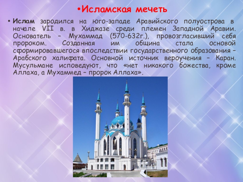 в Хиджазе среди племен Западной Аравии. Основатель – Мухаммад (570-632г.), провозгласивший себя пророком. Созданная им община стала основой сформировавшегося впоследствии государственного образования – Арабского халифата. Основной источник вероучения – Каран. Мусульмане исповедуют, что «нет никакого божества, кроме Аллаха, а Мухаммед – пророк Аллаха».