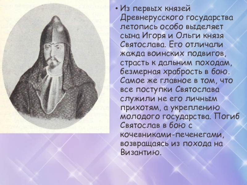 Ольги князя Святослава. Его отличали жажда воинских подвигов, страсть к дальним походам, безмерная храбрость в бою. Самое же главное в том, что все поступки Святослава служили не его личным прихотям, а укреплению молодого государства. Погиб Святослав в бою с кочевниками-печенегами, возвращаясь из похода на Византию.