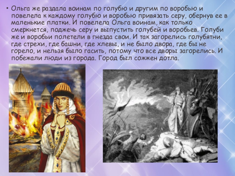 Слайд 9Ольга же раздала воинам по голубю и другим по воробью и