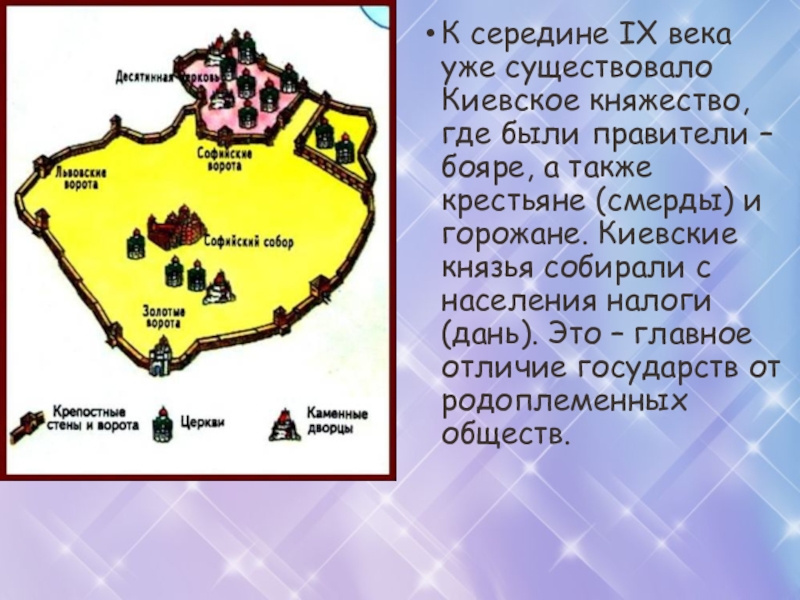 – бояре, а также крестьяне (смерды) и горожане. Киевские князья собирали с населения налоги (дань). Это – главное отличие государств от родоплеменных обществ.