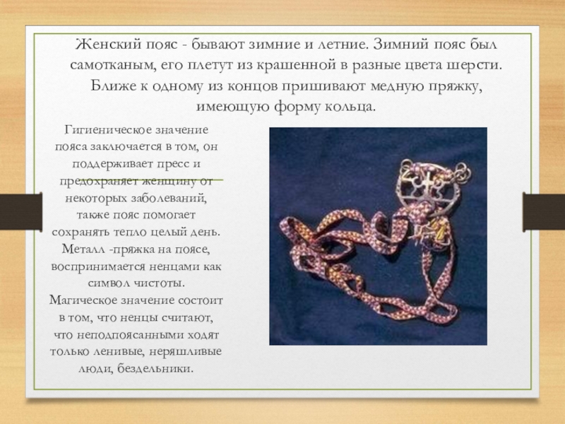 Магическое значение состоит в том, что ненцы считают, что неподпоясанными ходят только ленивые, неряшливые люди, бездельники.
