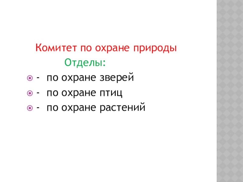 Комитет по охране природы      Отделы:- по охране зверей- по охране птиц-