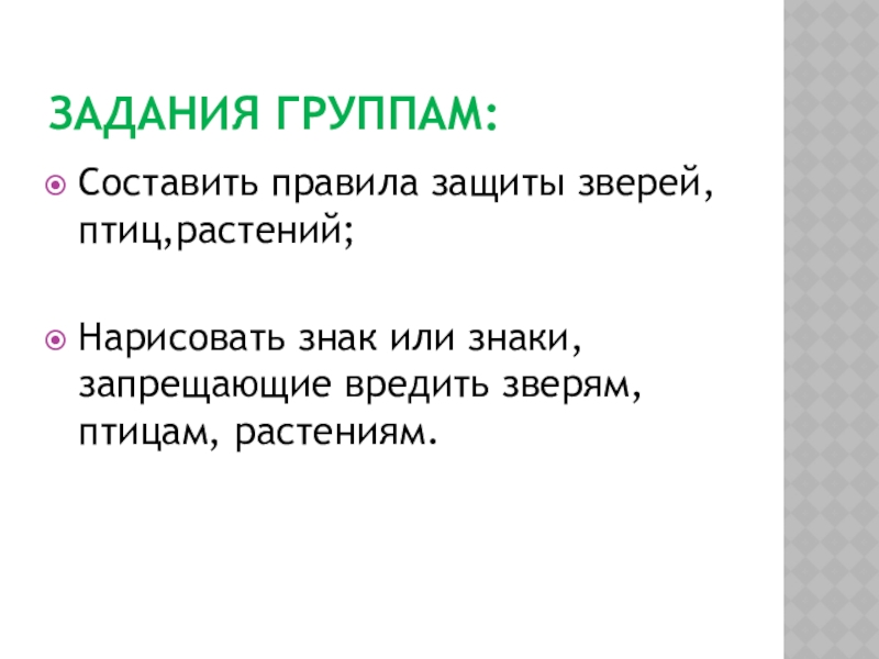 Задания группам:Составить правила защиты зверей,птиц,растений;Нарисовать знак или знаки, запрещающие вредить зверям, птицам, растениям.