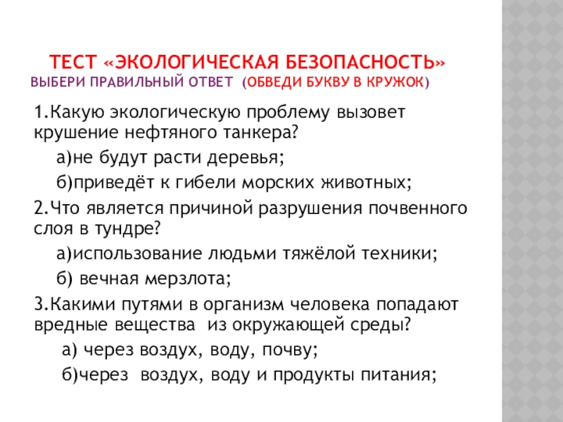 Тест «Экологическая безопасность» Выбери правильный ответ (обведи букву в кружок)1.Какую экологическую проблему вызовет крушение нефтяного