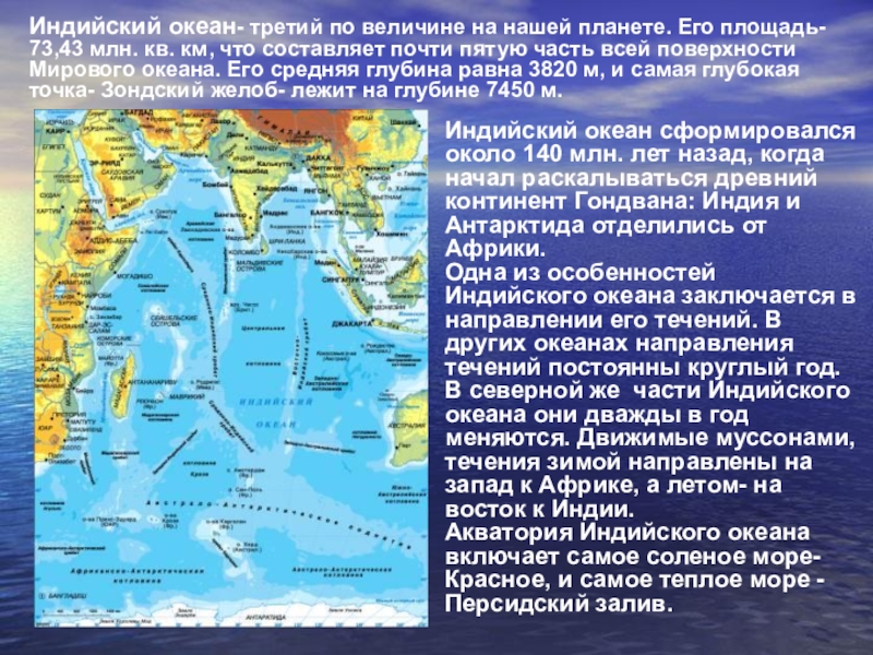 Индийский океан сформировался около 140 млн. лет назад, когда начал раскалываться древний континент Гондвана: Индия и Антарктида отделились от Африки.